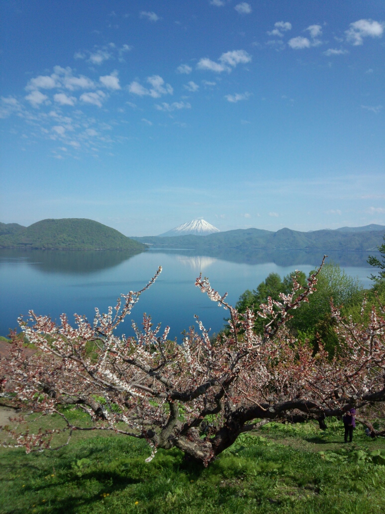 壮瞥公園の梅と洞爺湖と羊蹄山。