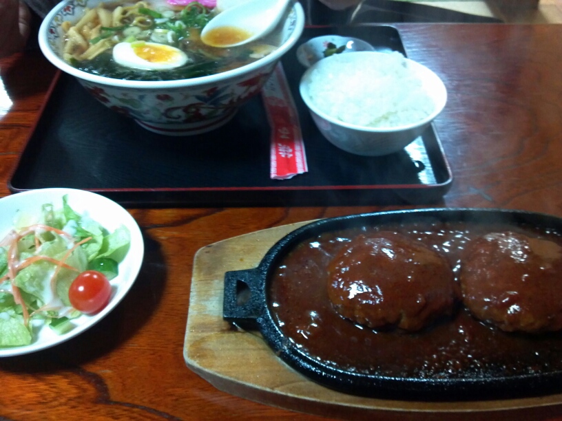 大盛で有名なこく一番の半ラーメンとハンバーグのセット。
