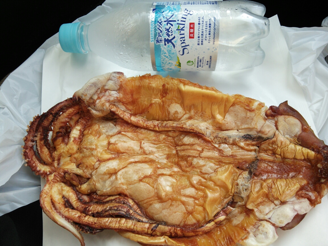 生のイカ一匹ををタレのようなものを塗ったあと、圧延機のようなものにかけて表面はかりっと、中は旨みが残るくらい柔らかく焼いたもの。