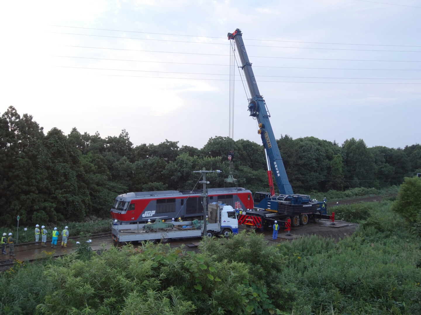 函館に行く途中に見かけた、脱線事故の引き上げ現場。