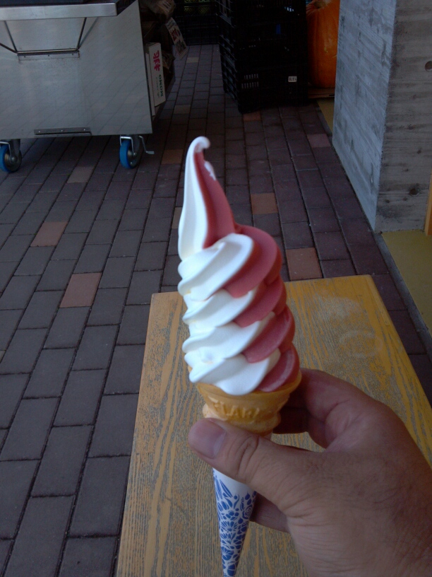 バニラは普通のソフトだけど、イチゴがややシャーベット状でかなりおいしい。