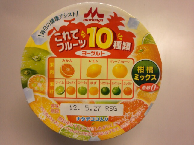 淡々と深夜のデザートを上げてみる。フルーツ10種類ヨーグルト(全て柑橘)。味は大変美味しい。が、これでフルーツ10種類と言うのはいささか無理があるのでは。味は美味しいんですけど。