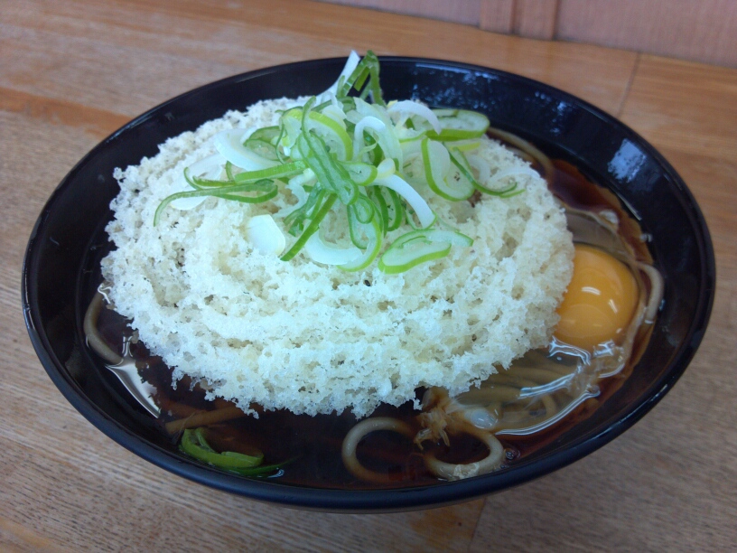 てんぷらと卵と油揚げ入りのそば。甘じょっぱくてうまいす。