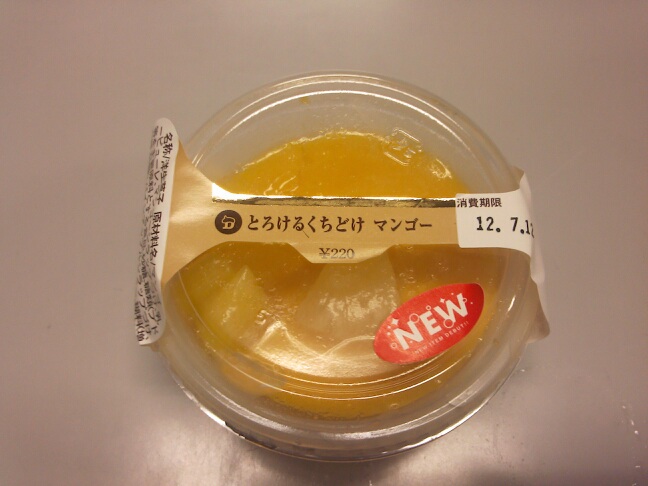 サンクスのとろけるくちどけマンゴー。ペースト状のマンゴー味のデザート。濃いめの味でうまいですが、なんか釈然としない感じ。少し凍らせるとうまいかも。